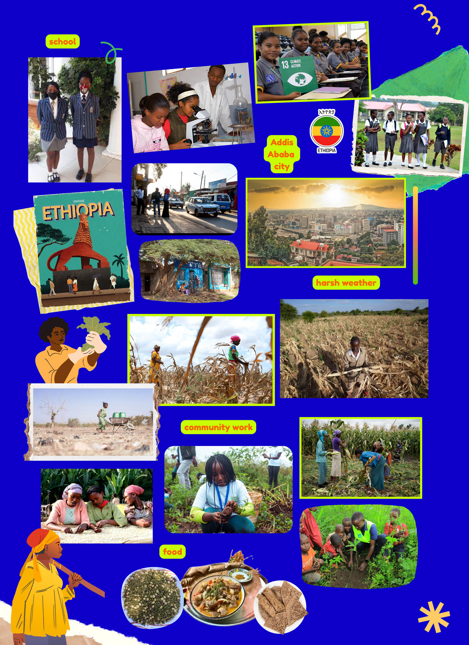 This moodboard grew out of immersive research- from collecting photos, scenes, and stories rooted in Ethiopia’s landscapes, schools, and communities, to listening deeply to how people live, learn, and respond to climate challenges. We pulled together images and information on classrooms, city streets, farmland, daily food, and community action provided by Our Future Agenda’s team to map Ethiopian life shaped by both culture and climate.
